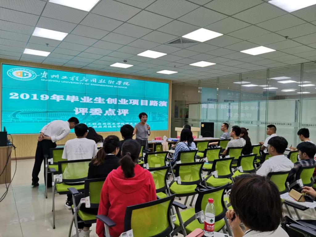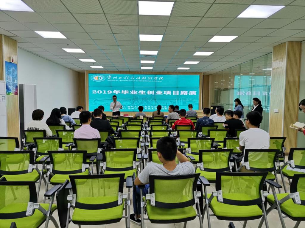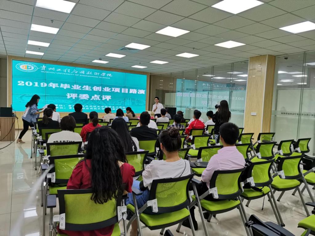 2019年6月11日14:00,由学生工作处主办,创新创业园承办的贵工程2019年毕业生创业项目路演活动在创新创业园路演大厅举行。丁虹、陈顺达、张晔、周杰、王天娥五位评审专家组成评审组,参加路演答辩的是通过初选的19个毕业生创业项目,实际到场14个。