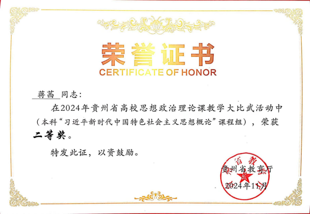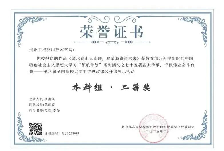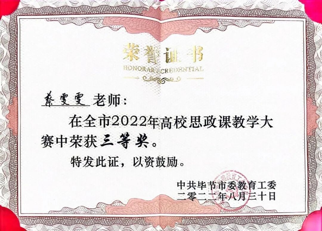 一心:高质量发展为统领学校为毕节市大中小学思政课一体化共同体建设联盟成员单位。全体思想政治理论课教师的积极性主动性充分发挥,助推思想政治理论课建设呈现新气象,8门思想政治理论课认定为省级“金课”,举办了“思政黔行-师师共研 思政乌蒙-高校力行——中国式现代化与高校思想政治理论课教学”毕节集体备课会。教师教学获奖层次高,彭雪莲副教授获得2022年第四届全国高校混合式教学设计创新大赛优胜奖,蒋茜博士获2024年贵州省高校思想政治理论课教学大比武活动习近平新时代中国特色社会主义思想概论课程本科组二等奖(第二名)。颜清辉博士申报的合作项目《中国哲学赋能传统中医诊所临床医师中医生命观构建和临床实践研究》获批2025年贵州省博士创新站,项目建设经费30万元整。蒋茜博士的2023年度高校人文社会科学研究项目(专项项目)《中国共产党革命精神谱系融入高校思想政治理论课教学研究》以良好等次结题。科研项目取得新成效,2021年以来有57项地厅级及以上课题获得立项,发表23篇论文,出版4本专著,有1份研究报告获得毕节市委领导批示,有1人获得贵州省教育科学研究优秀成果奖研究报告三等奖,有多人次为毕节市进行理论宣讲等社会服务。我院思想政治教育专业学生历年考研录取率一直位居全校人文社科专业前列,就业率高。教师指导学生参与的各类竞赛取得优异成绩,获得第八届全国高校大学生讲思政课公开课展示活动本科组二等奖1人次,2023年全国高校易班技术创新大会创新创意评比优秀展示奖1人次,全国三维数字化创新设计大赛17周年精英联赛(2024-2025)总决赛榜单数字工业设计大赛三等奖1人次。