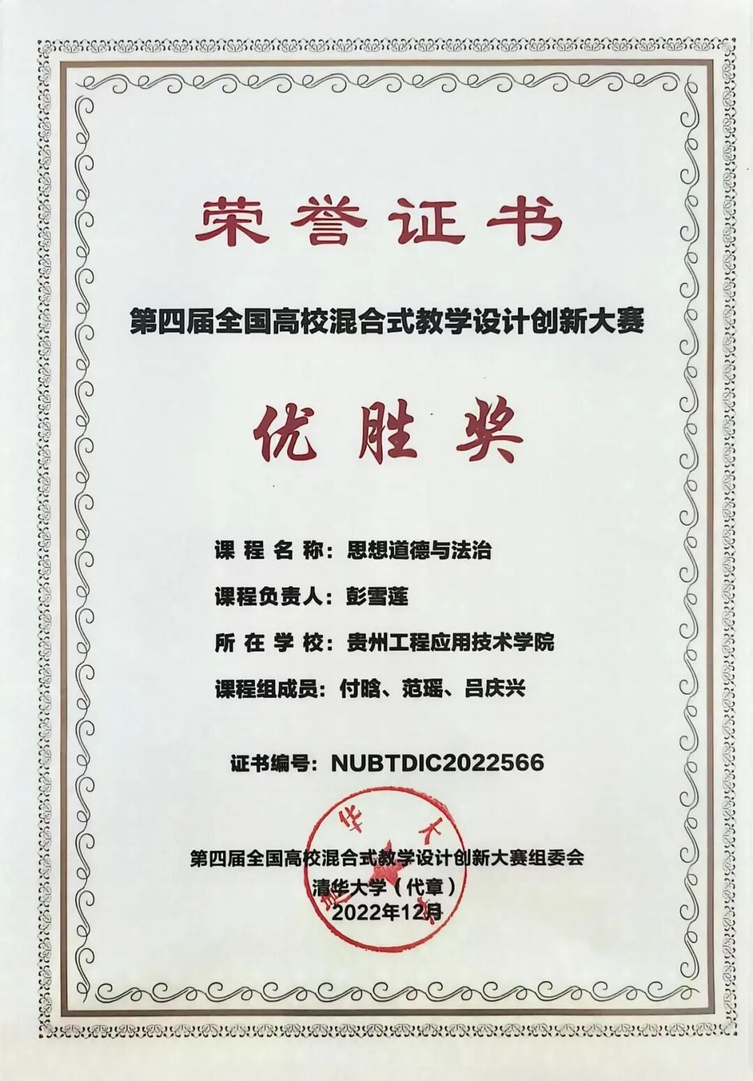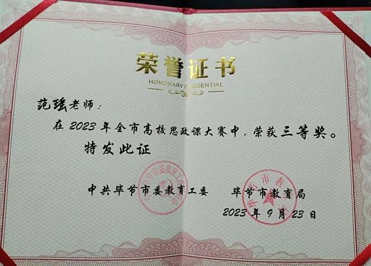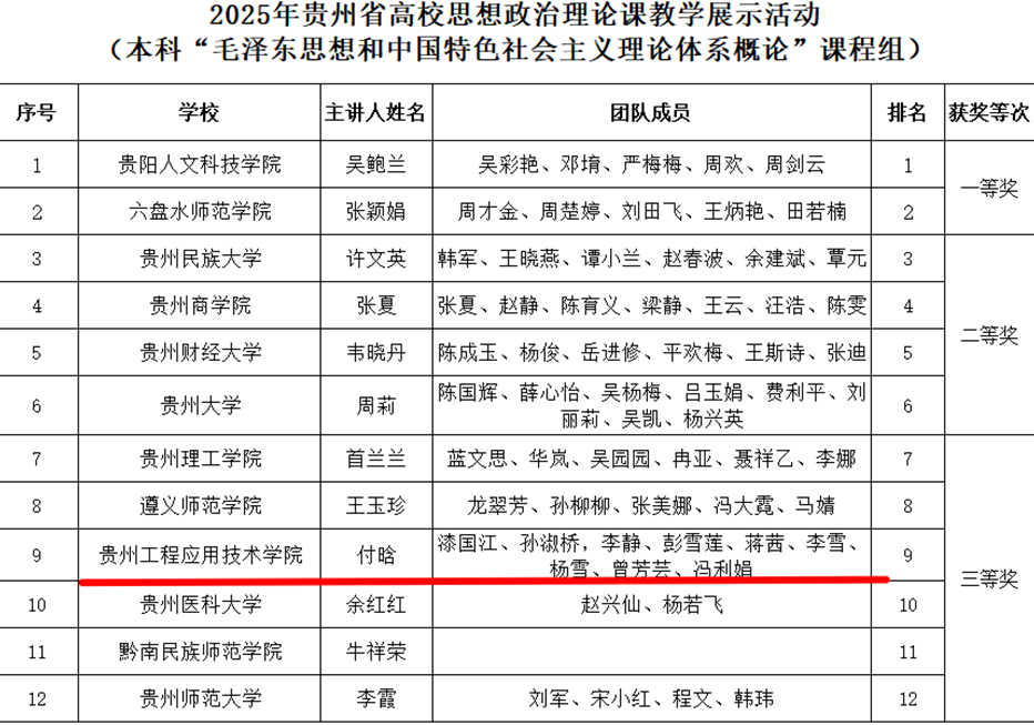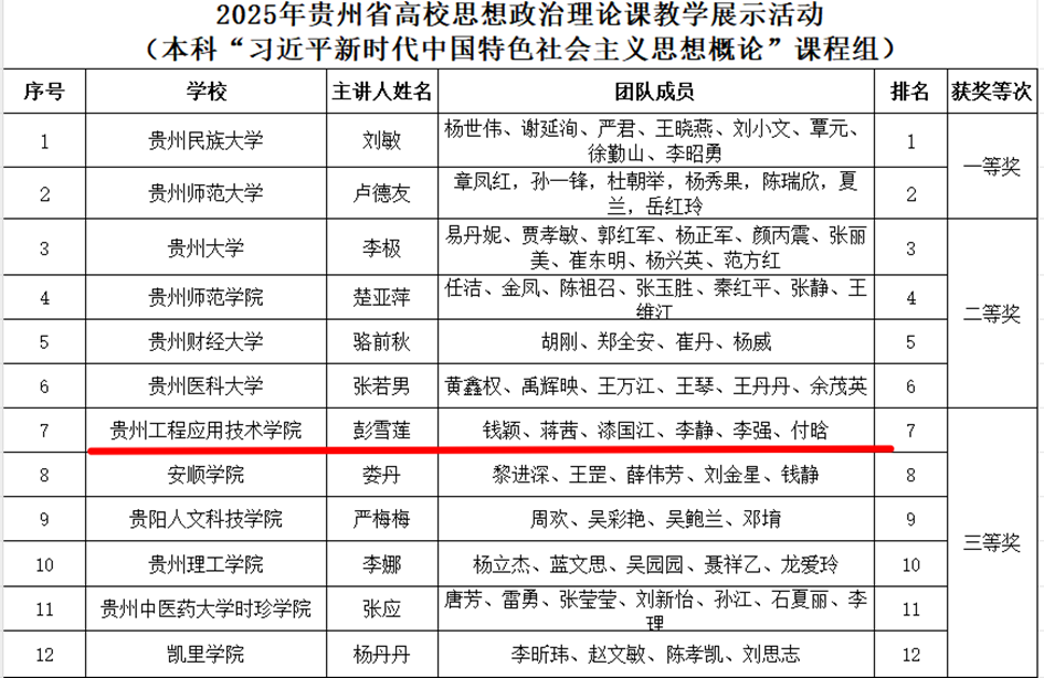 彭雪莲、潘智慧、曾芳芸、付晗四位老师在第四届全国高校思政课教学展示活动贵州省赛斩获三等奖,100%的获奖率成为马院教师省级比赛成绩的新突破。彭雪莲副教授、徐海闻老师先后获得2021年全市高校(高职)思政课教学大赛、2023年全市高校思政课大赛一等奖,蔡雯雯、范瑶两位老师分别获得2022年毕节市高校思政课教学三等奖、2023年全市高校思政课大赛三等奖。