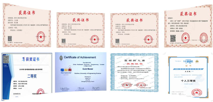近5年来,在专业建设方面,“计算机科学与技术”专业在省级专业评估中名列全省第三名,“软件工程”专业名列全省第四名,“数据科学与大数据技术”专业名列全省第五名。学院获省教育厅批准设置“大模型应用技术”微专业,计算机科学与技术”专业获贵州省一流本科专业建设点,《高级语言程序设计》课程获国家级一流课程。此外,还获省级一流“金课”5门,省级教改项目立项27项;获省级教学成果三等奖1项,校级教学成果二等奖1项,出版教材5部。在科研方面,立项国家自然科学基金(地区项目)1项,省部级科研项目立项26项,专利授权14项,发表高水平论文13篇 ,获软件著作权30项;在人才培养方面,获得国家级大创项目17项、省级108项;获得国家级各类学科竞赛一等奖2项、二等奖10项、三等奖68项、优秀奖2项,省级各等次学科竞赛奖240余项。