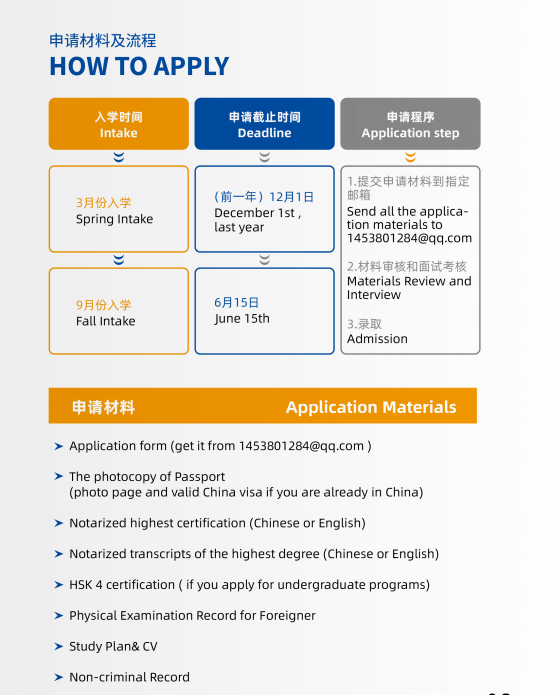 l Application form (get it from 1453801284@qq.com ) l The photocopy of Passport(photo page and valid China visa if you are already in China) l Notarized highest certification (Chinese or English) l Notarized transcripts of the highest degree (Chinese or English) l HSK 4 certification ( if you apply for undergraduate programs) l Physical Examination Record for Foreigner l Study Plan& CV l Non-criminal Record |