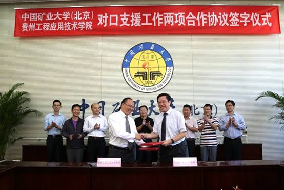 会上,向贤礼代表学校党委行政对中国矿业大学(北京)一直以来的倾力支持和帮助表示衷心的感谢,表示此次协议的签订标志着中国矿业大学(北京)对口支援我校的工作跃上了一个新平台,对我校为地方培育高层次应用型人才、促进两校对口支援工作出标志性成果具有重要意义,同时希望通过协议的实施为我校人才培养注入新的活力。范迅首先代表中国矿业大学(北京)党委行政对向贤礼副校长一行的到来表示欢迎,表示中国矿业大学(北京)将以这次协议的签署为契机,全面落实2016年两校联席会上确定的四大任务,充分发挥中国矿业大学(北京)在人才培养、科学研究、学科建设等方面的优势,全力助我校发展。