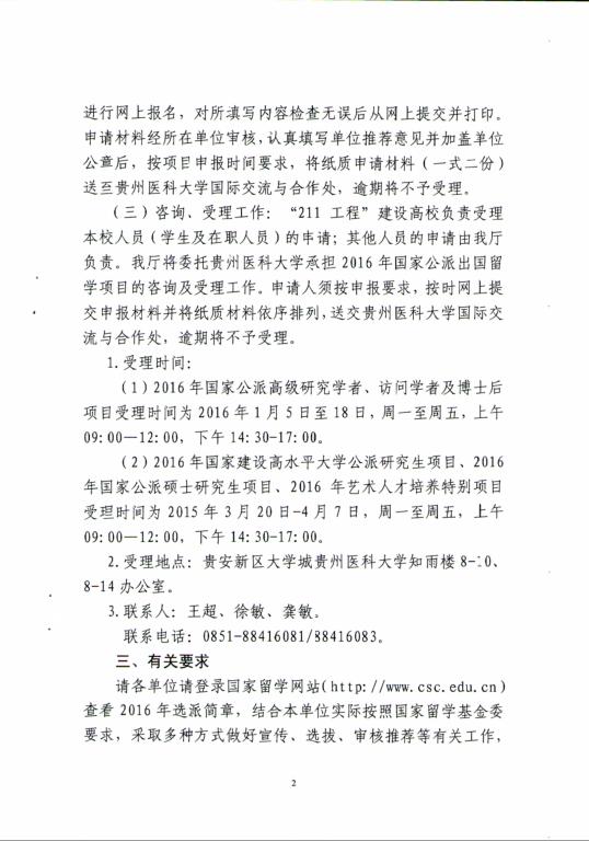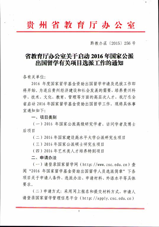 根据《省教育厅办公室关于启动2016年国家公派出国留学有关项目选派工作的通知 》(黔教办函〔2015〕256号,以下简称《通知》)精神,2016年国家公派出国留学有关项目。为做好我校教职工对该项目的申报工作,特转发《通知》,详情请参阅附件。