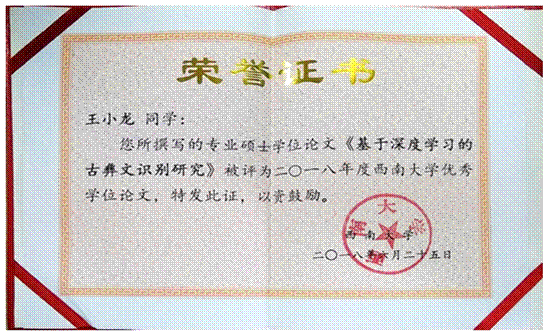 2018年7月,西南大学2018届研究生优秀学位论文评选结束,学校与西南大学联合培养的硕士研究生王小龙同学的学位论文因研究水平和创新突出,荣获本届信息学科专业硕士唯一的优秀学位论文。