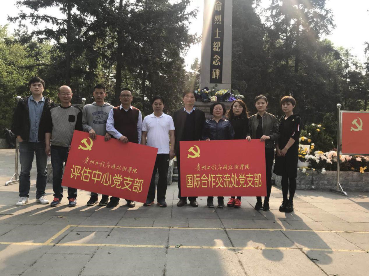 2018年4月4日,国际合作交流处党支部、评估中心党支部及部门全体职工赴毕节烈士陵园开展缅怀先烈,寄托哀思暨爱国主义教育、革命传统教育活动。学校党委副书记汤宇华同志参加活动。祭扫仪式为宣读扫墓祭词、默哀、献花。仪式结束后,汤宇华同志、陈忠勇同志给全体同志讲红军故事,进行爱国主义教育、革命传统教育。最后,组织参观毕节烈士陈列馆。