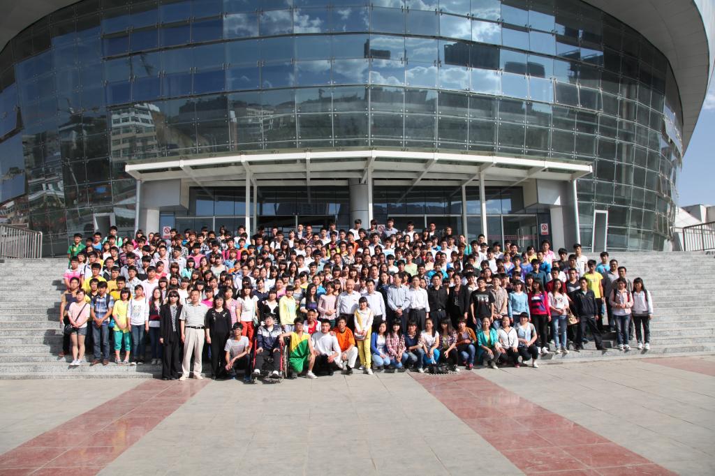 在绣山体育馆,朱英龙与我校获绣山助学金的学生代表亲切交谈并合影留念。