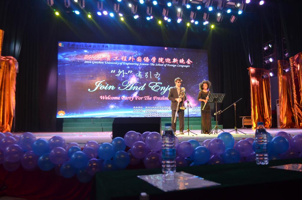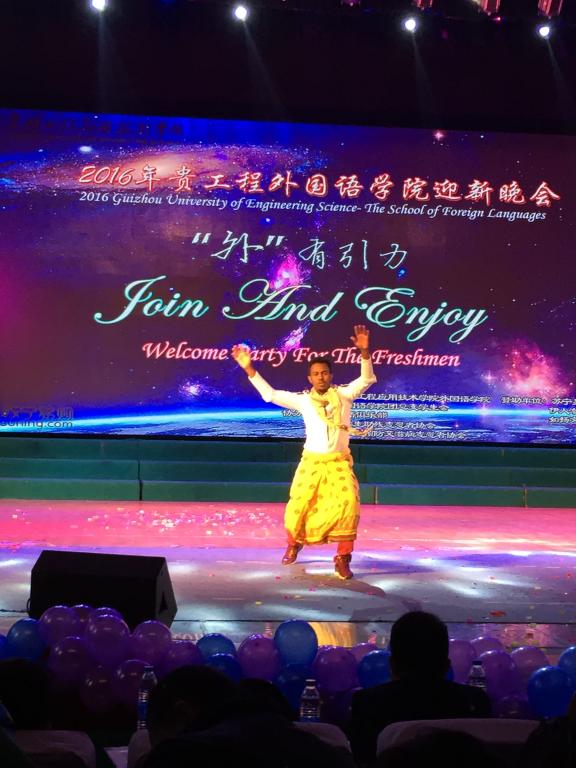晚会节目充分体现外国语学院的专业特色,节目类型丰富,有英语、日语歌曲演唱、相声、舞蹈等。我校外籍教师Chauncey与Victoria的乐器表演与索马里籍留学生Mohamed的传统舞蹈将晚会驶入高潮。