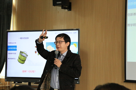 在培训中袁博作了题为“混合式教学:理念、设计与实践”的专题报告。他从“有朋自远方来”“创新教学理念”“创新教学实践”“博学明辨笃行”等四个方面展开讲解,语言生动、风趣幽默、感染力强。“教学要有教育情怀,教学不是本能,要心存敬畏之心”“对待学生要晓之以理、动之以情、付之以爱”“没有培养出学习的兴趣和能力是教育的最大失败”“教学的目的是让学生养成终身学习的习惯,培养学生自主学习能力”“一门课可能改变学生的未来”“教学要不断创新”“提升学生的社会胜任力”等教育理念引起了参训教师的共鸣,也展示一名学者对教育事业的热爱,对人才培养的责任担当,对教学的敬畏之心。
