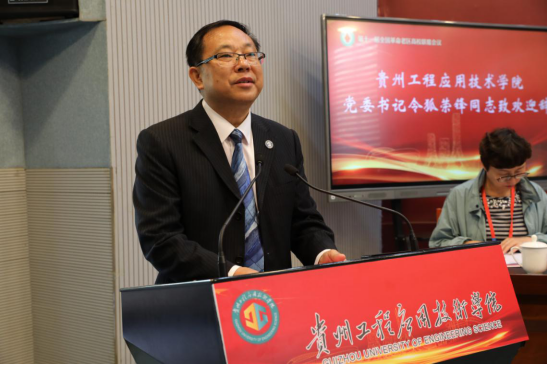令狐荣锋在致辞中代表贵州工程应用技术学院对与会领导和代表们的到来表示热烈欢迎与衷心感谢。他向大家介绍了我校的发展历程及现在的基本情况。他指出,一直以来,学校始终把传承红色基因与落实“立德树人”根本任务有机融合,立足毕节厚重的红色文化资源,深入挖掘、收集、汇聚、积淀和再创作,成功打造了大型红色题材舞剧《林青的远方》,建成了“黔西北红色文化传承成果展示中心”及“红色黔西北”微信公众号、大学文化展览馆、“流沧三部曲”等一系列思想政治教育工作平台。这些平台为学校及地方的理想信念教育、革命传统教育、爱国主义教育提供一个有高度、有温度、更实用、更好用的新型工作阵地。
