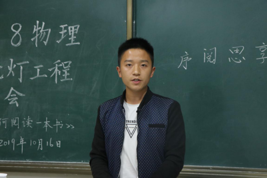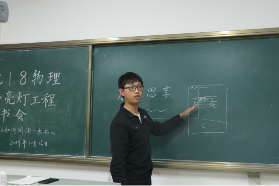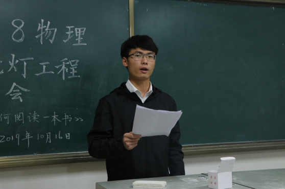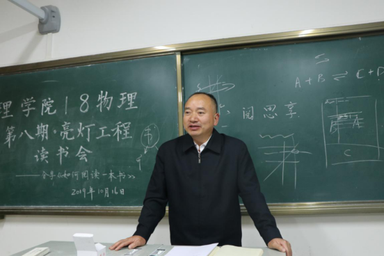 “腹有诗书气自华”。读书有修身养性凝神之良效,书籍也是点亮人生路最旺的火把。为营造同学们读好书、好读书的学习氛围,贵工程理学院2018级物理本科班于10月17日晚七点在西综205教室如期举办第八期”亮灯工程”读书会。理学院党总支书记王兴,2018级物理本科班班主任王洪标前来指导本次读书会。理学院2019级部分班级、团干部参与观摩学习交流。