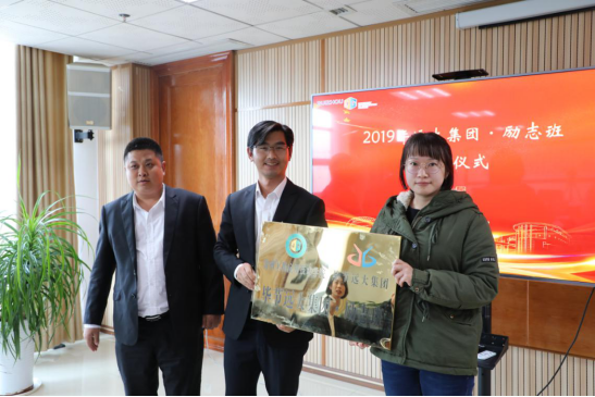 潘超授“毕节远大集团•励志班”牌,励志班班主任李晓坡和郭媛接牌。
