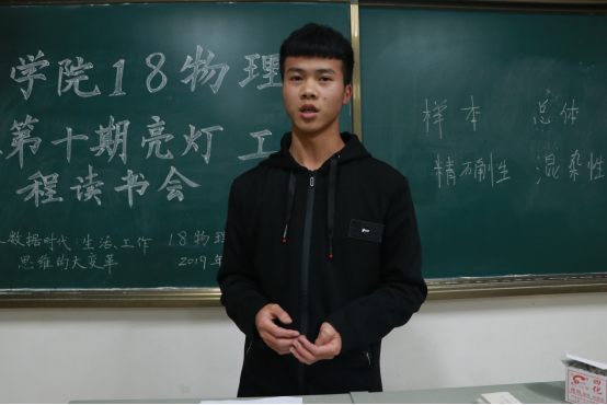 读书会上,2018级物理班的同学积极分享自己的读书感受。刘培发同学说,大数据时代,是名副其实的信息社会,所以弄清是什么比寻找为什么更重要;大数据时代,一切皆可数据化,所以,只有不断地挖掘数据的价值,发现事物发展的规律,才能为更好地做好科学决策。符义斌同学说,大数据带来了三个颠覆性观念:一是全部数据,而不是随机取样;二是大众方向,而不是精确制导;三是相关关系,不是因果关系。面对大数据的利与弊,符义斌说:“既要能应用,也要能控制”。肖长征同学说,大数据产生的最直接价值是一个大规模生产、分享、和应用数据的时代正在开启,在现今的社会,大数据的应用越来越彰显它的优势,它占领的领域也越来越大,目前,企业界正是充分利用电子商务,物流配送等方面的大数据来论证、调整发展思路,创新运营模式。任林波、王永杰、汪冲冲、卢永欣、付政福等同学也进行了相应的分享,活动在何庆云同学的分享中圆满结束。
