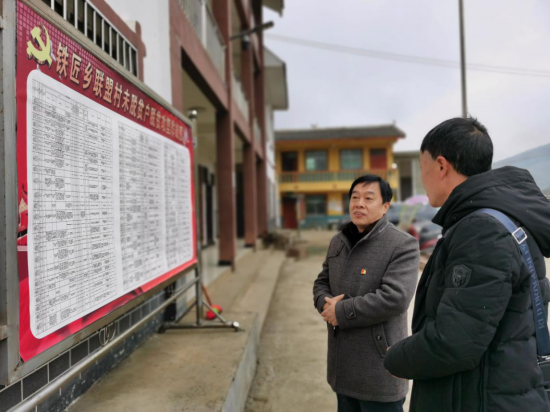 走访慰问结束后,汤宇华来到联盟村村公所,实地查看建档立卡贫困户扶贫档案,边翻阅边提问驻村第一书记及驻村工作组的其他同志,听到大家对建档立卡贫困户的基本情况、帮扶情况清清楚楚,他很欣慰,随后,他来到铁匠乡联盟村贫困户跟踪服务图前,认真观看,仔细询问,听到驻村第一书记对铁匠乡联盟村贫困户跟踪服务情况明明白白,如数家珍,他很欣喜,并要求联盟村两委一队三个人一定要对标对表,以钉钉子精神抓好脱贫攻坚工作。
