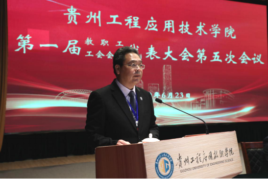 在深入学习贯彻习近平新时代中国特色社会主义思想和党的十九大精神、落实2020年全国“两会”精神之际,经过贵工程一届五次教职工代表大会暨一届工会会员代表大会第五次会议筹委会的精心筹备,6月23日下午,贵州工程应用技术学院第一届教职工代表大会第五次会议暨第一届工会会员代表大会第五次会议在正心礼堂召开。会议全体代表及特邀代表参加会议,会议由校党委副书记汤宇华主持。
