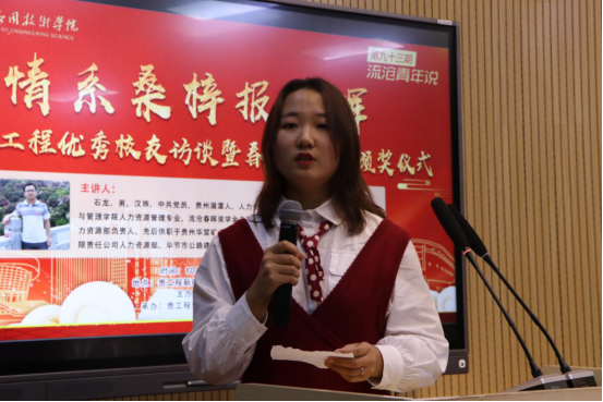 10月15日晚,由贵工程校团委、经管学院主办,经管学院学生科和团总支承办的“情系桑梓报春晖——贵工程优秀校友访谈暨春晖奖学金颁奖仪式”在学校新时代青年讲习所举行。本期特邀嘉宾为贵工程优秀校友、流沧春晖奖学金发起人之一毕节市公路建设养护有限公司人力资源部石龙校友经管学院党总支副书记唐纲及师生代表100余人参加座谈会