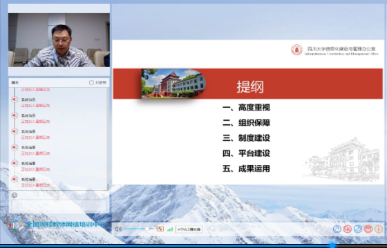 会上,教育部高等教育教学评估中心副主任周爱军作了《立足信息时代 坚持共享服务 推进高等教育质量监测创新发展》的动员讲话;天津市教育委员会连忠锋处长作了《做好数据监测 提高教学质量 促进人才培养》的报告;教育部高等教育教学评估中心孙亚飞老师作了《强化监测预警建设 做好数据填报分析》的主题培训;四川大学信息化建设与管理办公室副主任王绍朋作了《四川大学新时代智慧统计分析的探索》的汇报。