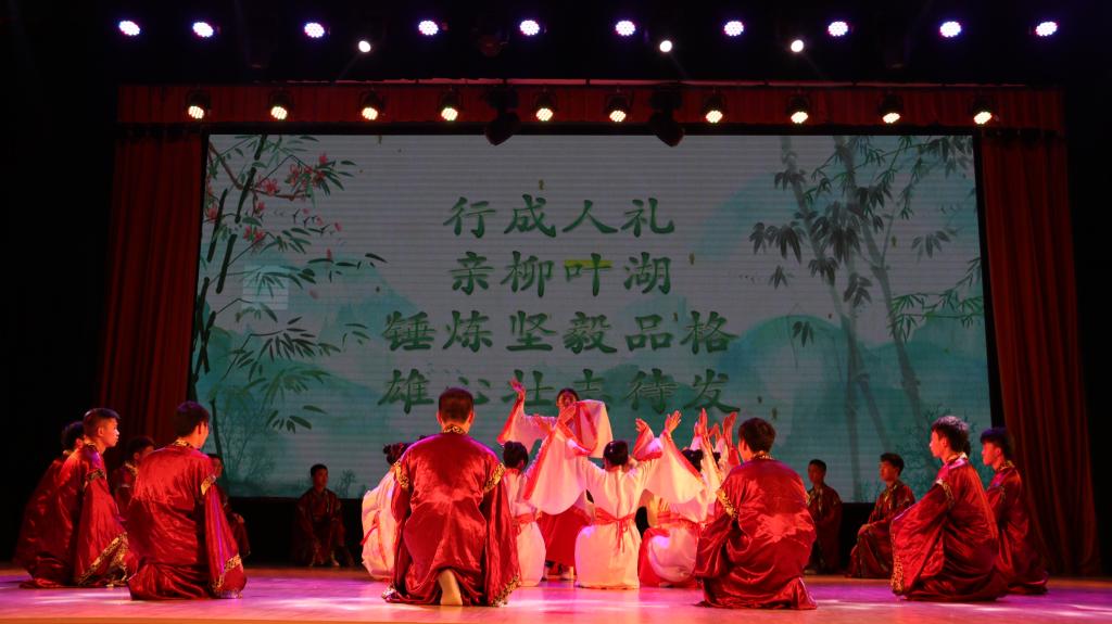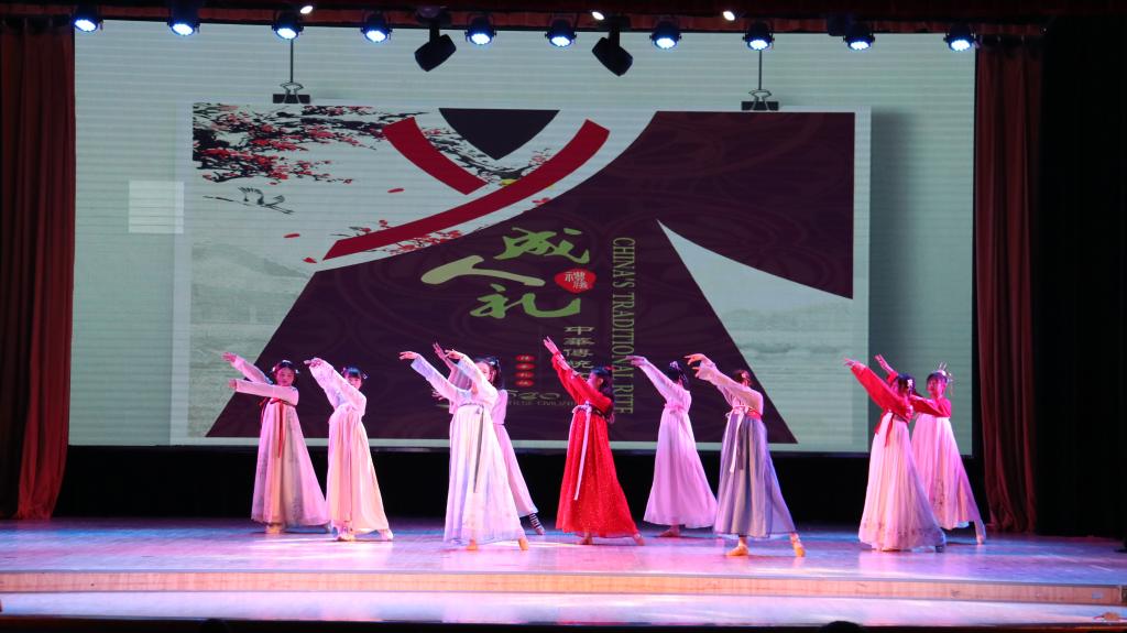 “满酌流霞看舞袖,步步锦裀红皱。”成人礼以汉唐舞《清平乐》开场,曼妙的舞姿,轻盈的步伐,带领同学们梦回盛世唐朝;一睹盛唐风采,拥抱中国文化,感受汉服艳丽而不媚俗、朴素而不暗淡的风采,彰显中华文化底蕴。