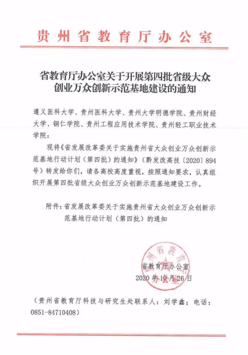 近日,贵州省教育厅办公室下发了《省教育厅办公室关于开展第四批省级大众创业万众创新示范基地建设的通知》),我校获批为第四批“省级双创示范基地”。