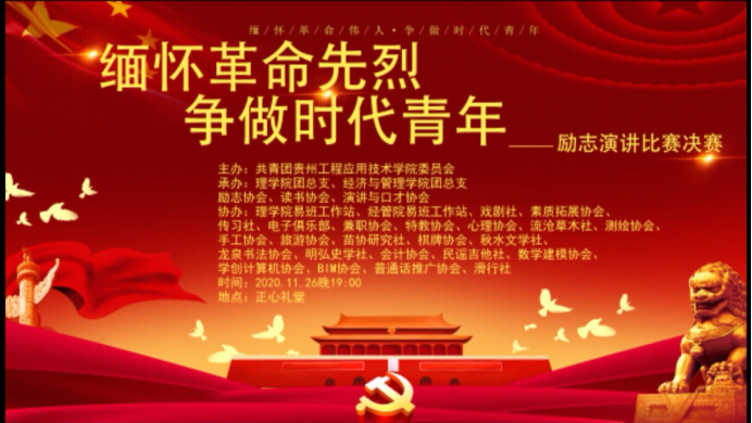 为引导广大同学学习革命先烈的崇高精神,传承红色基因,激发新时代大学生的爱国情怀。11月26日,贵州工程应用技术学院在正心礼堂举办了主题为“缅怀革命先烈,争做时代青年”的演讲比赛。此次比赛由共青团贵州工程应用技术学院委员会主办,励志协会、读书协会和演讲与口才协会承办,300余名同学参与此次比赛。