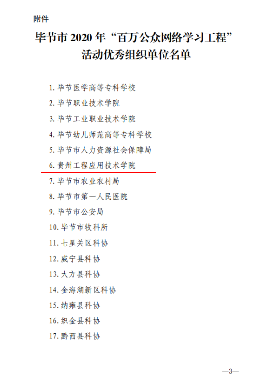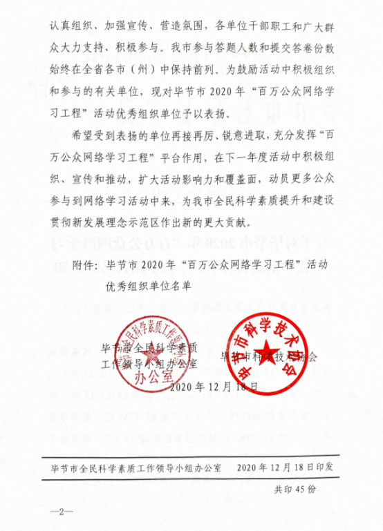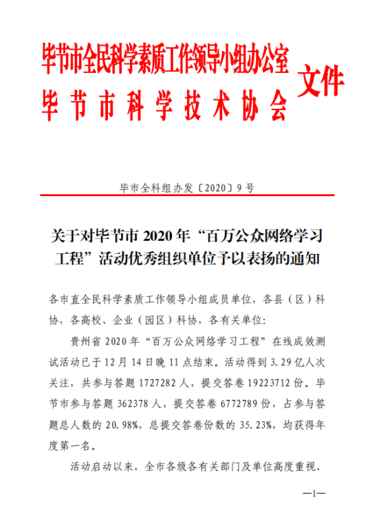 近日,毕节市全民科学素质工作领导小组办公室发布了《关于对毕节市2020年“百万公众网络学习工程”活动优秀组织单位予以表扬的通知》,我校在毕节市2020年“百万公众网络学习工程”活动中获优秀组织单位。