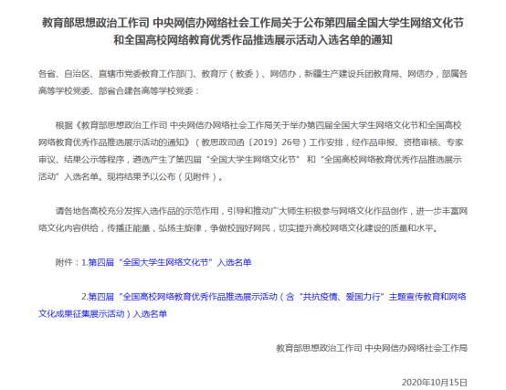 据悉,本次“全国高校网络教育优秀作品推选展示活动”包含“共抗疫情、爱国力行”主题宣传教育和网络文化成果征集展示活动,设置有歌曲类、短视频类、书画设计类、工作案例类、网文类和音频类6个类别,经作品申报、资格审核、专家审议、结果公示等程序,共有来自全国高校的200个作品获奖。