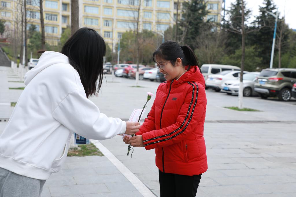 志愿者为老师送花