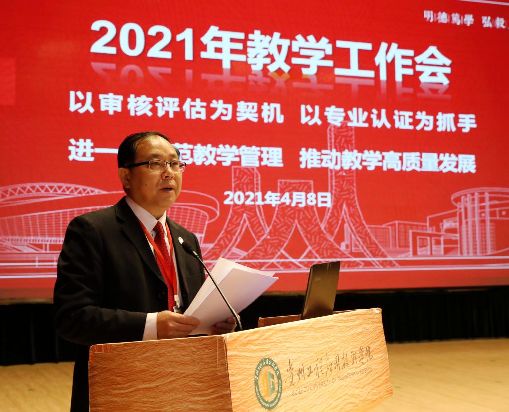 为深入学习贯彻习近平新时代中国特色社会主义思想和党的十九届二中、三中、四中、五中全会精神,全面落实全国、全省教育大会以及中国共产党贵州工程应用技术学院第二次代表大会精神,奋力开启学校“十四五”本科教育教学工作新征程,4月8日下午,我校在正心礼堂召开“以审核评估为契机 以专业认证为抓手 进一步规范教学管理 推动教学高质量发展”为主题的2021年教学工作大会,校党委书记令狐荣锋,党委副书记、校长王建平,党委副书记汤宇华、向贤礼,党委委员、副校长李琳、杨友昌出席大会,全体处级干部、教务处、督导团全体成员、各学院专业负责人、辅导员、获表彰人员、师生代表350余人参加,会议由汤宇华主持。