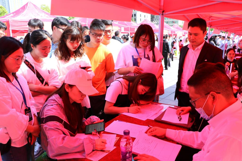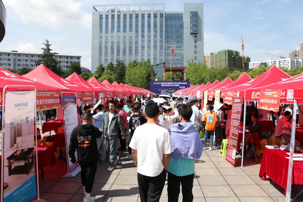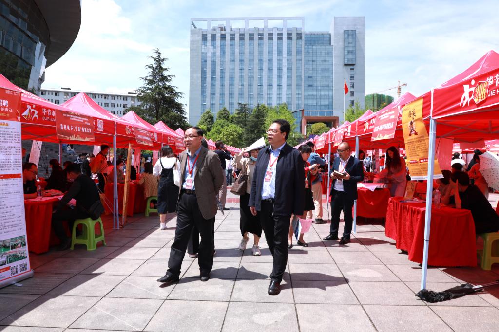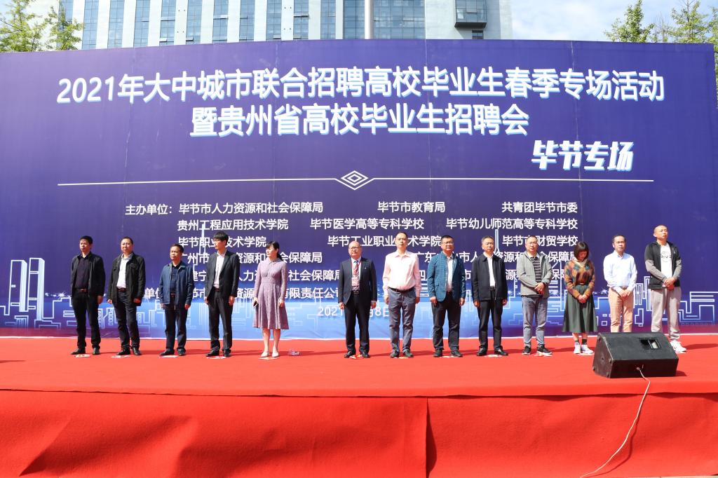 5月8日,贵州工程应用技术学院与毕节市人力资源和社会保障局、毕节市教育局、共青团毕节市委、毕节市属有关高校等政府单位深化校政合作,联合举办的2021年大中城市联合招聘高校毕业生春季专场招聘会毕节专场在贵州工程应用技术学院明德广场举行。此次招聘会,由毕节市人力资源与社会保障局牵线搭桥,协同广州市、中山市、宁德市、宜宾市人力资源和社会保障局引进优质企业到场参加。广州市人力资源市场中心主任李汉章、宜宾市人力资源社会保障局党组成员、市农民工服务和就业创业促进中心主任甘华锋、福建省宁德市人力资源和社会保障局劳动就业服务中心主任刘幼玉、广东省中山市人力资源和社会保障局一级主任科员、中山市人力资源管理办公室副主任钟旭明、毕节市人力资源和社会保障局党组成员、副局长王孕秋、毕节市人力资源和社会保障局三级调研员、市就业局局长陈环、毕节市教育局党组成员、副局长朱德贵、共青团毕节市委副书记马永江、贵州工程应用技术学院党委委员、副校长李琳、各毕节市市属高校就业工作相关负责同志出席活动现场。