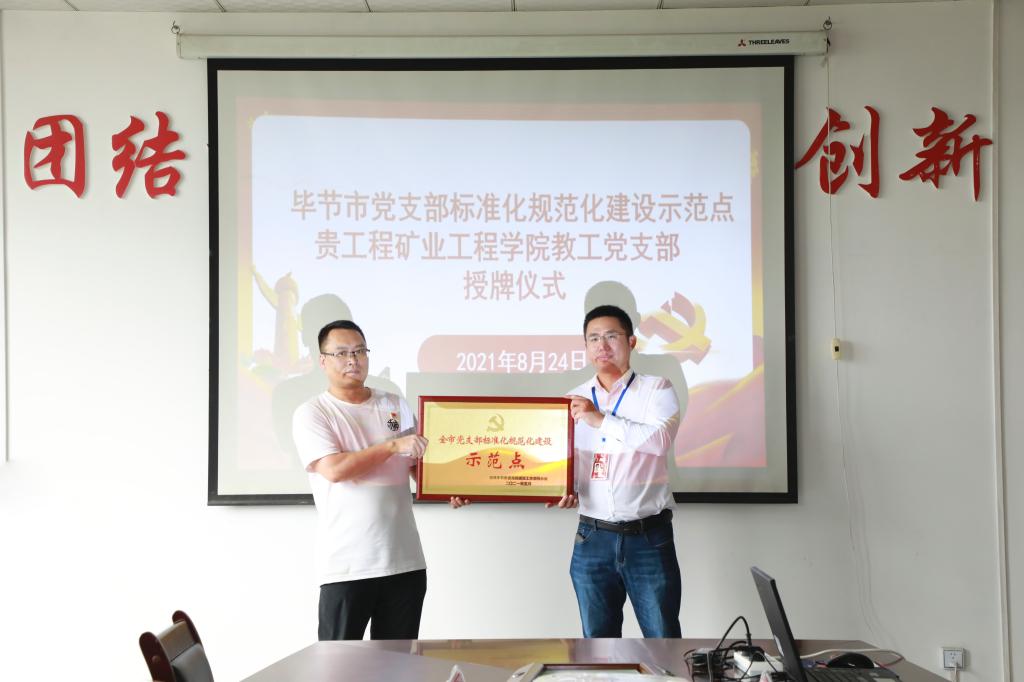 会上,陈键宣读《中共毕节市委党的建设工作领导小组关于命名第二批“全市党支部标准化规范化建设示范点”的通知》(毕节党建发〔2021〕2号);徐龙向我校矿业工程学院教工党支部授牌。
