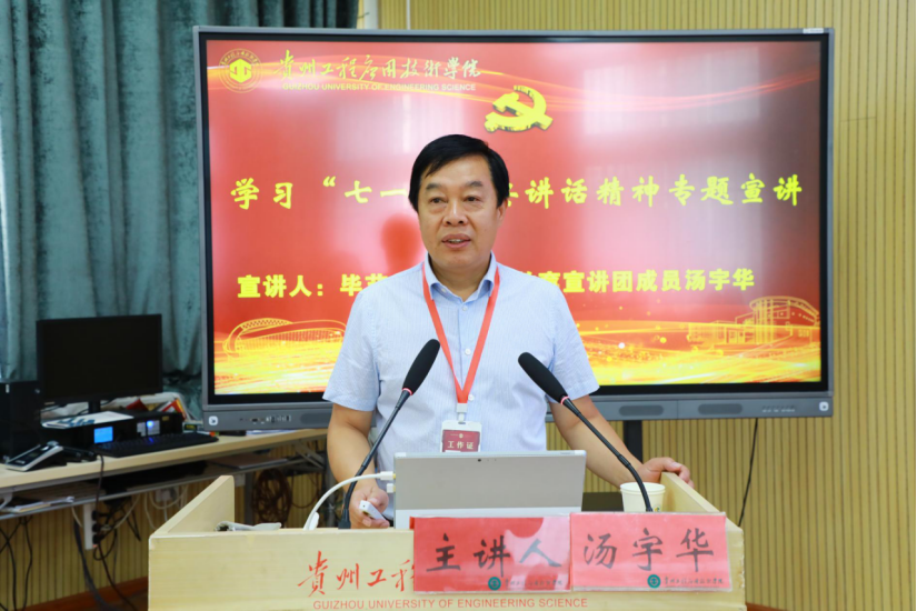 汤宇华从我校实际出发,按照毕节市党史学习教育宣讲工作的相关要求,结合省委书记谌贻琴在贵州省庆祝中国共产党成立100周年大会上的讲话精神,从把握重点、深刻感悟、办好实事、推动发展四个方面展开,深刻阐述了学习习近平总书记“七一”重要讲话精神的重大意义、主要内容和丰富内涵。宣讲过程中,汤宇华结合国内外典型案例、学校先进典型给现场师生带来了一堂别开生面、生动鲜活的宣讲报告。汤宇华指出,要深刻感悟习近平总书记“七一”重要讲话精神的政治伟力,增强“四个意识”、坚定“四个自信”、做到“两个维护”;要学懂弄通党的创新理论,提高政治判断力、政治领悟力、政治执行力,按照“我为群众办实事”实践活动工作方案提出的相关要求,从五个着力点出发,切实为群众办实事解难题。汤宇华强调,在中国共产党领导下,贵州实现了从发展滞后到后发赶超的巨大转变,要始终把习近平新时代中国特色社会主义思想和习近平总书记对贵州对毕节工作的重要指示批示精神作为总遵循、总纲领,坚持把建设贯彻新发展理念示范区作为最鲜明的主题,抢抓机遇,推动发展。