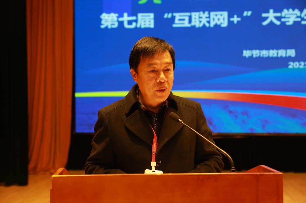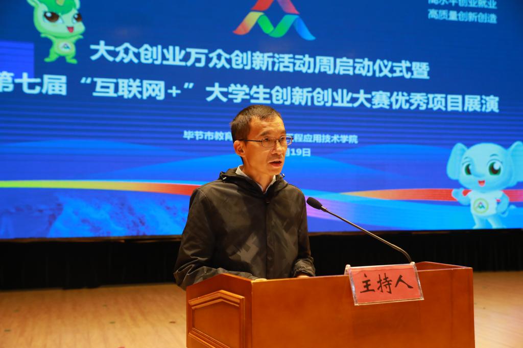 启动仪式上,汤宇华代表学校党委、行政向“十三五”期间在创新创业、就业改革等方面取得突出成绩的师生表示衷心祝贺和亲切问候。他指出,“互联网+”大学生创新创业大赛已成为高等教育领域落实立德树人根本任务、提高人才培养质量的重要举措,成为推动高校创新创业教育改革的重要平台、展示新时代高等教育教学改革成果的重要窗口和大学生实现创新创业梦想的全球盛宴,为新时代大学生绽放自我、展现风采、服务国家提供了新平台,为世界创新创业教育改革提供了中国智慧、中国方案。汤宇华表示,近年来,贵工程积极响应中央、国务院“大众创业万众创新”工作部署,把深化创新创业教育改革作为向应用型转型、提高人才培养质量的重要抓手,“十三五”期间在创新创业教育改革方面取得突出成绩,成为贵州省首批深化创新创业教育改革示范校,成为贵州省唯一的一所全国典型经验50强高校。他强调,“十四五”期间,创新驱动发展的国策依然不变,我们将以习近平新时代中国特色社会主义思想为指导,立足新发展阶段、全面贯彻新发展理念、构建新发展格局,继续深化创新创业教育改革,将创新创业教育,思想政治教育和专业教育深度融合,持续推进学校“12345”创新创业教育体系建设,重点抓好双创课程建设、双创师资队伍建设、双创平台建设,以中国国际“互联网+” 大学生创新创业大赛为重要抓手,深化人才培养模式改革,提高专业人才培养质量,依托黔西北红色文化,聚焦乡村振兴,把青年红色筑梦之旅打造为一门有温度有情怀的社会实践金课。随后,他宣布我校2021年“大众创业万众创新”活动周正式启动。