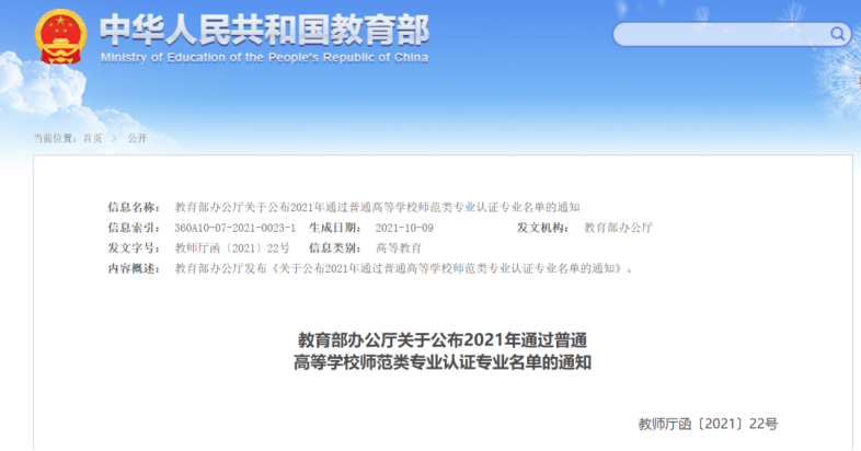 近日,教育部公布2021年通过普通高等学校师范类专业认证的专业名单,我校汉语言文学专业通过师范类专业第二级认证。