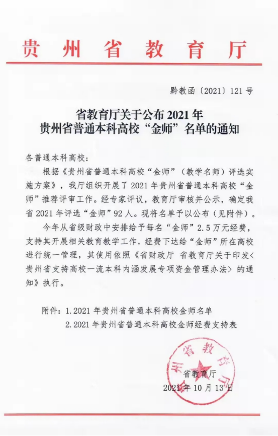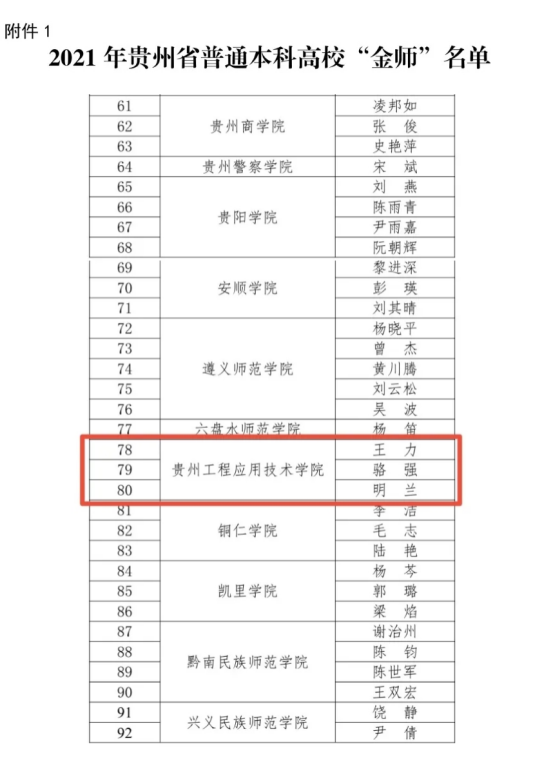 近日,2021年贵州省普通本科高校“金师”称号公布,我校教师王力、骆强、明兰三位教授获此殊荣。他们潜心教学、攻坚克难、钻研学术,谱写育人诗篇;他们以生为本、爱生如子、以身治教,尽显师之风范。