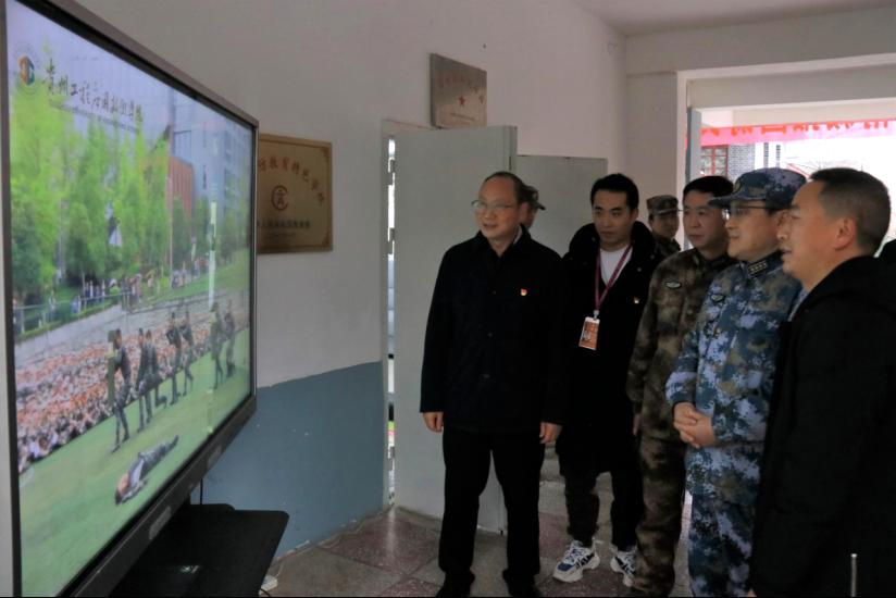 隋圣陶一行检查了学校武装部建设情况,参观了新时代讲习所、黔西北红色文化传承成果展示中心、新三馆和教官团训练展示,对我校的国防教育工作和武装部规范化建设表示肯定,对我校在贯彻落实习近平强军思想重要论述上,充分利用革命老区红色文化资源优势开展国防教育工作表示认可。
