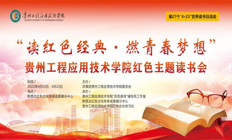 4月22日、23日,在国务院新闻办公室首次发布《新时代的中国青年》白皮书及第27个“4·23”世界读书日之际,贵工程校团委携手贵州省级教育系统“理想信念教育基地”——贵工程黔西北红色文化传承成果展示中心和省级高校名辅导员工作室——贵工程“员员港湾”辅导员工作室及“全国百强学生社团”——贵工程红色文化传习社三大平台联合推出“读红色经典·燃青春梦想”红色主题读书会。