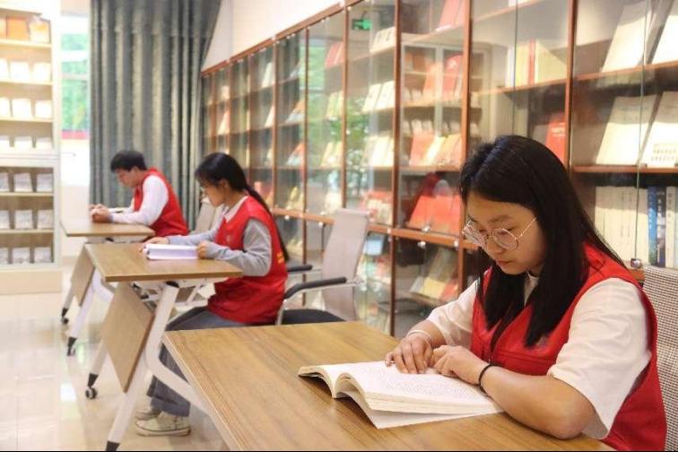 红色文化传习社成员在“传承红色基因主题图书陈列·阅览室”进行自主学习现场