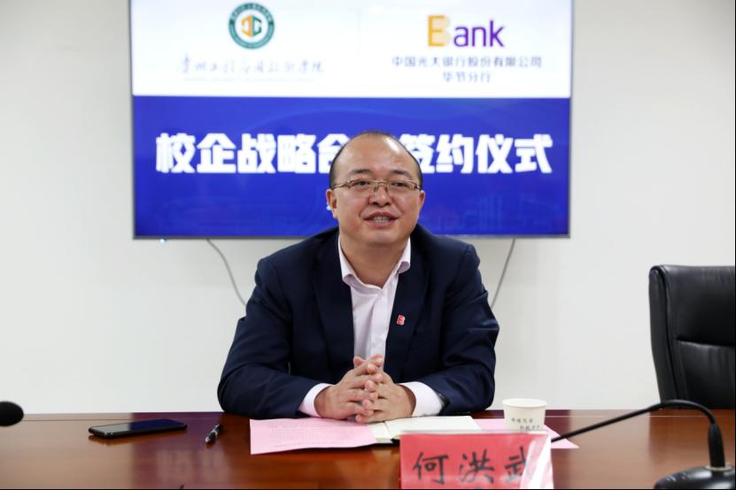 5月11日上午,我校与中国光大银行(毕节分行)在西区综合楼902会议室举行校企战略合作签约仪式,我校副校长朱杰、中国光大银行(毕节分行)行长何洪武、副行长谭伟出席会议,学校党委组织部、计划财务处、对外合作交流处、经济与管理学院等部门及学院相关负责人、中国光大银行(毕节分行)职能部门相关负责人参加会议。会议由朱杰主持。