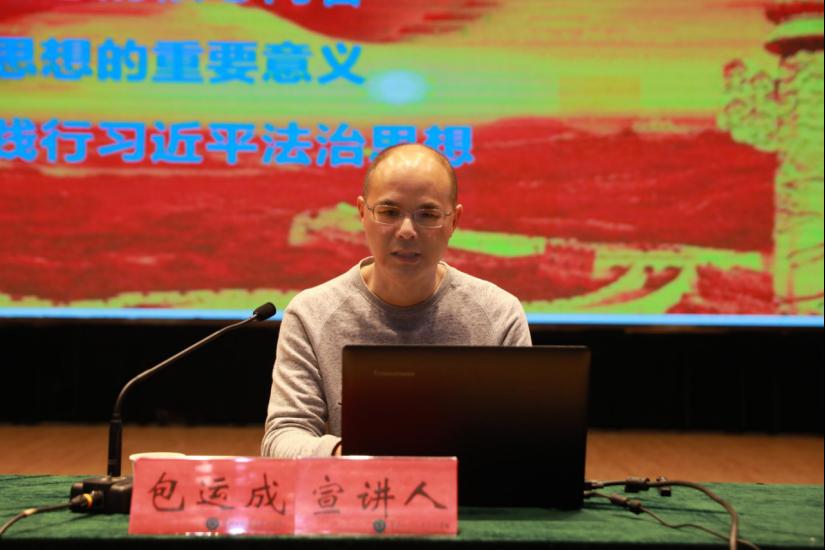 会上,包运成紧扣“学习和践行习近平法治思想”这一主题,结合高校大学生的特点,用丰富的案例和实践,就习近平法治思想的形成和确立、习近平法治思想的核心内容、习近平法治思想的重要意义、大学生如何践行习近平法治思想等方面进行了系统阐释和深入解读。他指出,习近平法治思想具有重要的政治、理论、实践意义,为加快建设公正高效权威的社会主义司法制度、推进国家治理体系和治理能力现代化提供了科学指引、注入了强大动力,为中国特色社会主义法治体系和社会主义法治国家建设提供了强大思想武器,是新时代推进全面依法治国的根本遵循和行动指南。他要求,要深刻理解和把握习近平法治思想的核心要义,切实把习近平法治思想贯彻落实到学习、生活和工作中;要真心尊法、认真学法、严格守法、正确用法,在全社会形成“以遵纪守法为荣、以违法乱纪为耻”的风尚,学会运用法律同违法犯罪行为作斗争,正确地用法律来保护自己的合法权益,践行好习近平法治思想。