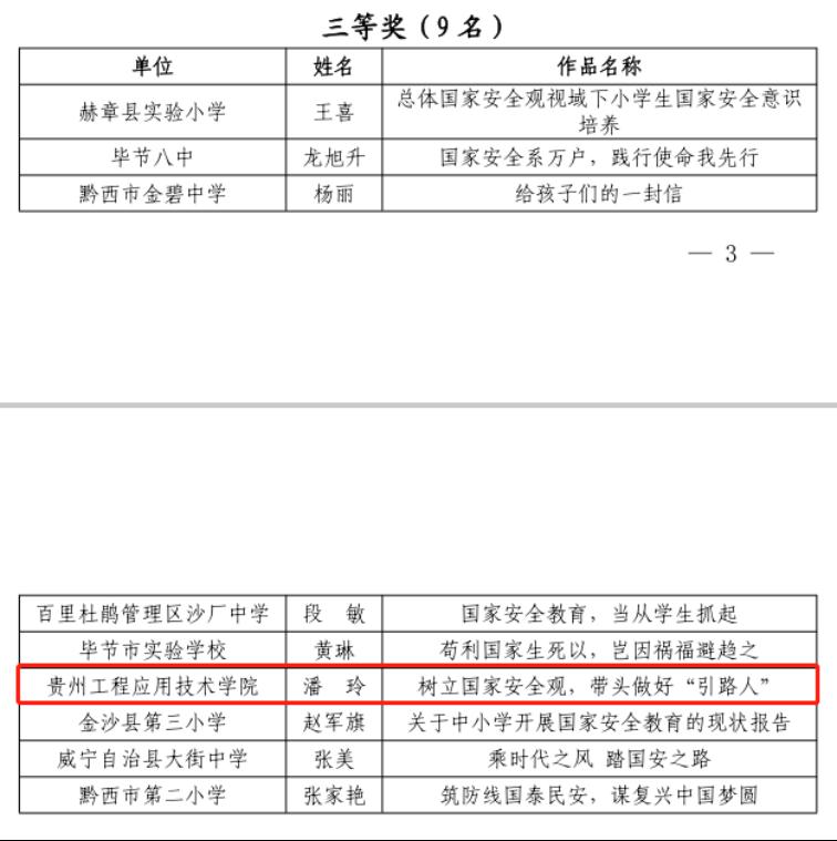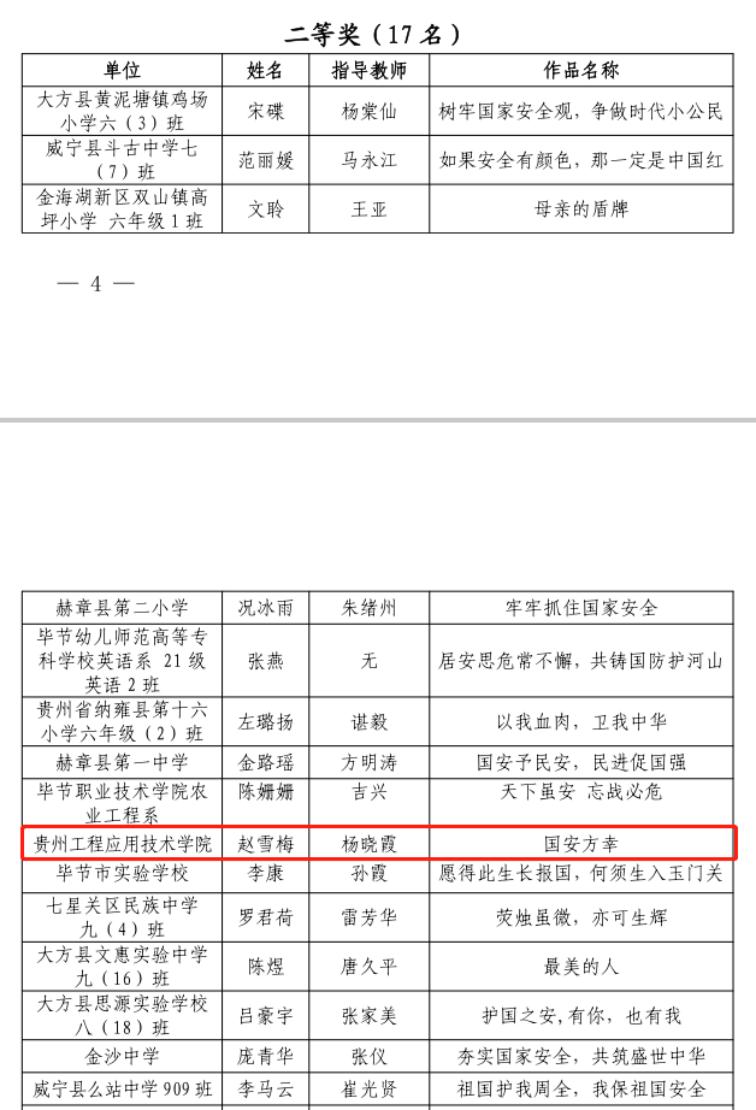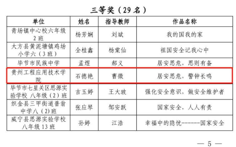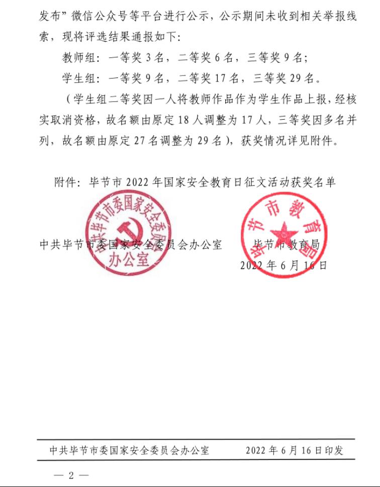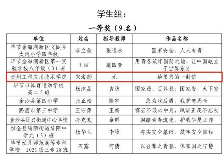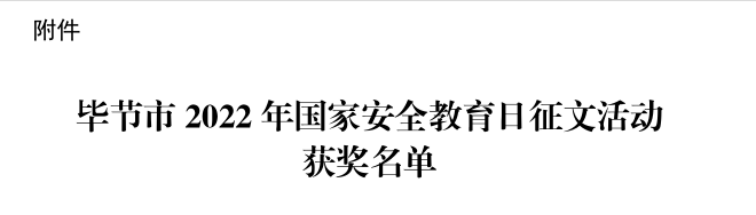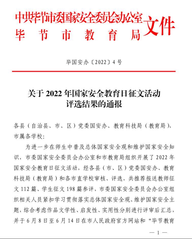 近日,毕节市2022年国家安全教育日征文活动评选结果已出炉,我校教师潘玲的征文《树立国家安全观,带头做好“引路人”》获得教师组三等奖;我校学生宋海韵的征文《给弟弟的一封信》获得学生组一等奖;我校学生赵雪梅的征文《国安方幸》获得学生组二等奖,指导老师为杨晓霞;我校学生石德艳的征文《居安思危,警钟长鸣》获得学生组三等奖,指导老师为曹微。