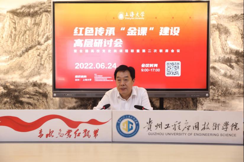 6月24日,红色传承“金课”建设高层研讨会暨全国高校党史类课程联盟第二次联席会在上海召开,会议由上海大学主办,上海大学“教育部课程思政教学研究示范中心”、上海高校思想政治理论课名师工作室——顾晓英工作室、上海大学教务部及全国高校党史类课程联盟共同承办,线上线下同步举行,我校在黔西北红色文化传承成果展示中心设分会场,校党委副书记汤宇华出席视频会并作交流发言,校团委及马克思主义学院思政课师代表、红色文化传习社学生代表参加视频会。