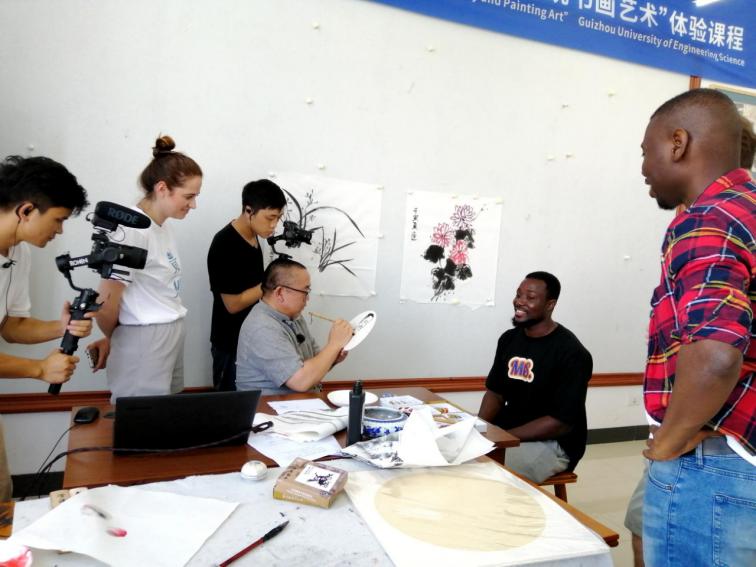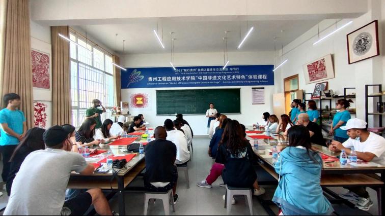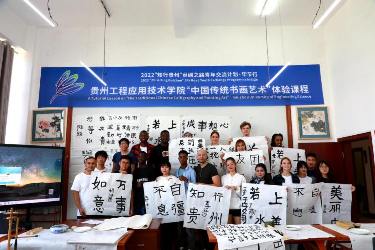 7月6日-7日,2022“知行贵州”丝绸之路青年交流计划·毕节行中外青年走进贵工程,开展“中国传统书画艺术”“少数民族传统教育体育”“中国非遗文化艺术(蜡染、剪纸)”等课程交流,来自四川大学、成都大学、广州大学、湖北汽车工业学院的留学生在水墨漫画像写生和书法绘画课上泼墨挥毫,共同领略中国书法之魅力,传统水墨绘画、肖像漫画的艺术韵味;通过参与太极拳体验活动和趣味运动会,了解民族传统体育运动的基本理论与知识,感受少数民族传统体育项目特色;还通过实操体验中国传统民间工艺美术·织金蜡染、民族民间美术·黔西剪纸的艺术内涵。