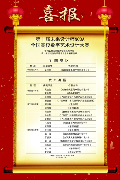 本次获奖作品多为贵工程艺术学院与毕节市文化产业发展协会合作的助农推广作品,作品主题紧紧围绕“推广毕节旅游资源发展,助力毕节农副产品走出毕节”。为帮助贵工程学子在竞争激烈的大赛中脱颖而出,艺术学院高度重视,成立工作领导小组,组建指导教师团队,从选题、概念表达到最终设计作品呈现,前后历经5个多月。能在本次全国高校数字艺术设计大赛中荣获优异成绩,既展现了艺术学院设计系师生的风采和良好的教学水平,也充分彰显了贵州工程应用技术学院立足毕节,服务地方的办学理念。