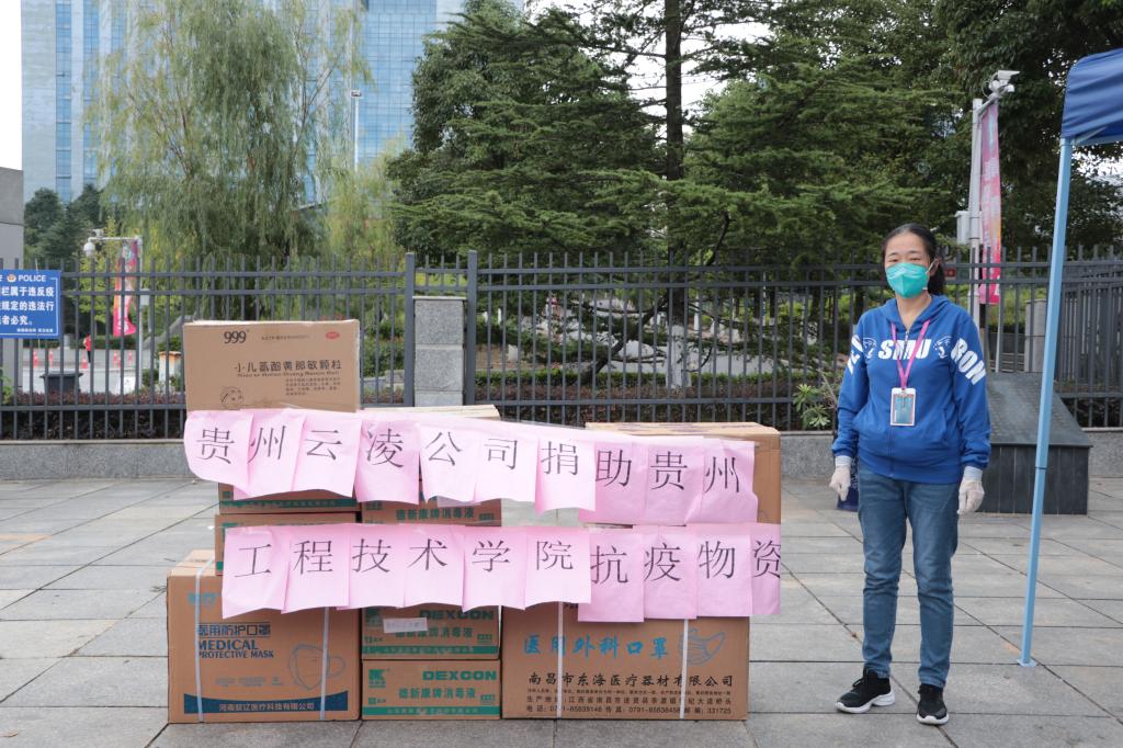贵州云凌公司为我校送来了1500个N95口罩、5000个一次性口罩、200瓶75%酒精(500ml)、200双手套等物资,并送来了公司全体员工的敬意与问候。