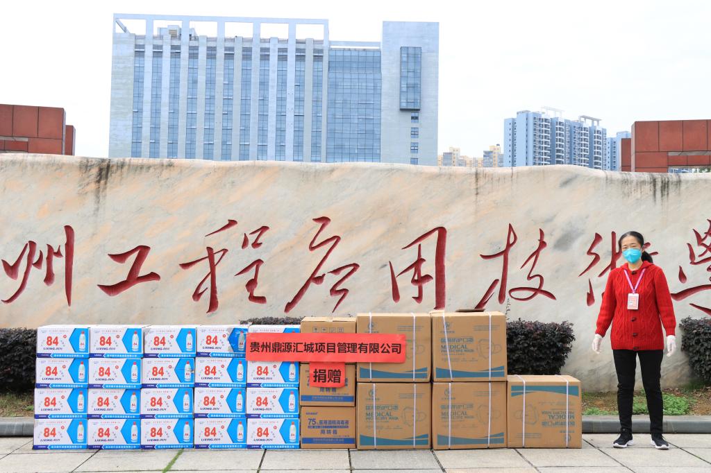 贵州鼎源汇城管理公司为我校奋战一线的工作人员送来了6000个N95口罩、600瓶84消毒液、600瓶75%酒精(500ml),积极为疫情防控工作做出贡献。