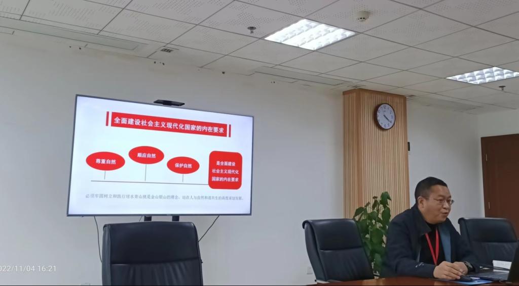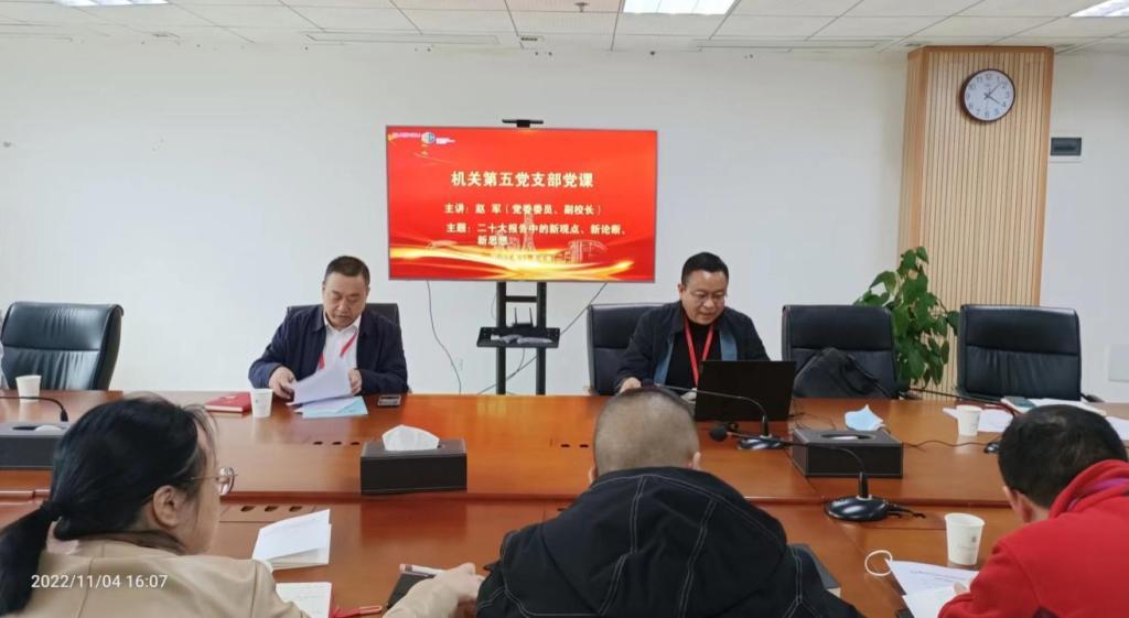 11月4日,校党委委员、副校长赵军在西区综合楼902会议室为机关第五党支部全体党员及入党积极分子上专题党课。党课的主题为“党的二十大报告中的新观点、新论断、新思想”。