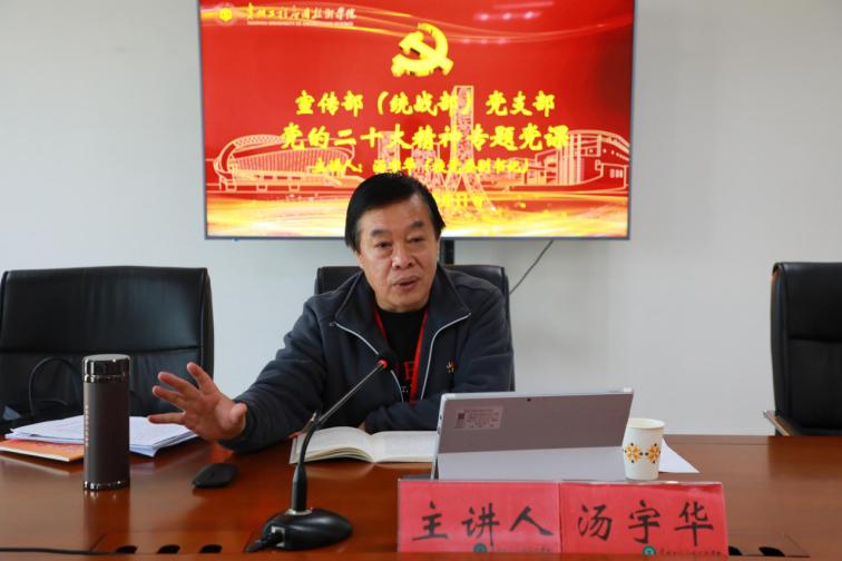 11月11上午,校党委副书记汤宇华到西区综合楼902会议室宣传部(统战部)党支部宣讲党的二十大精神。