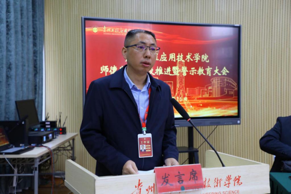 会上,矿业工程学院党总支书记、人文学院党总支书记分别以“牢记立德树人使命,推进师德师风建设”、“铸魂、力行、致远,深入推进师德师风建设”为题作交流发言;杨友昌介绍学校师德师风建设情况;郭永红通报高校违反师德师风典型案例,以案示警,教育引导广大教师自警、自醒、自重。
