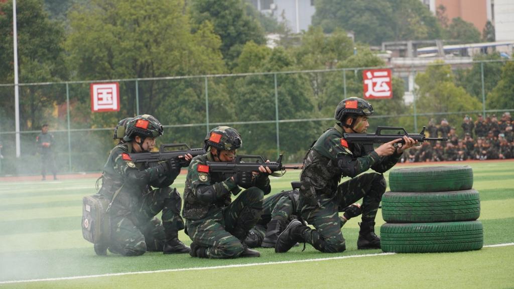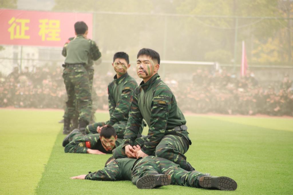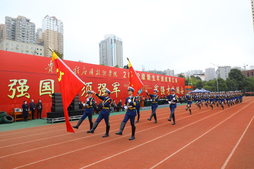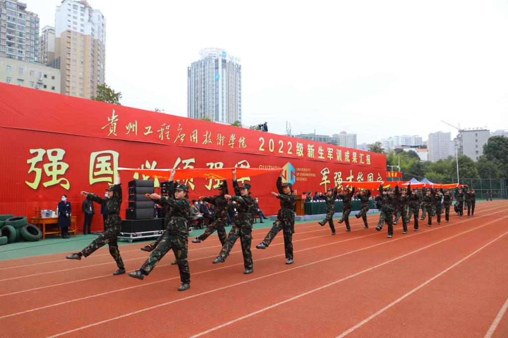 军训汇报大会在全体师生奏唱中华人民共和国国歌中拉开帷幕。在雄壮的军乐声中,各个方队昂首阔步,气势豪迈地依次通过主席台,接受大学第一课的检阅。新生军训学员还进行了分队队列、内务整理、急救包扎、战术基础动作、匕首操、擒敌拳、刺杀操展示;军训教官团进行了摔擒倒功展示,花式枪操队列表演,特种战术展示。表演充分展示了新时代大学生朝气蓬勃,斗志昂扬的精神风貌。