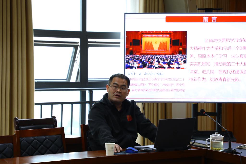 宣讲会上,朱杰围绕突出“八个重点把握”抓深学;紧扣“三个关键聚焦”抓细悟、着力“十个方面提升”抓笃行,对党的二十大精神的核心要义、丰富内涵和重大意义进行了全面系统的阐释和深入浅出的解读。宣讲结合党的十八大以来习近平总书记对贵州、毕节工作的重要指示、批示精神和系列重要论述;结合新国发2号文件和《推动毕节高质量发展规划》的贯彻情况;结合省、市、校的发展状况;结合分管、联系部门(学院)工作实际以及当前学校正在推进的重要工作,强调要着力从党建、学科、教育教学、人才队伍、科学研究、开放办学、校园建设、社会服务、服务示范区、内部治理、经费投入等多角度、宽视野抓好党的二十大精神的学习宣传贯彻,并将其转化各项工作的具体措施,推动学校各项工作在新征程上再上新台阶,推动党的二十大精神更好地在学校生根开花、落地见效。要求要在把握总目标、总方向、总要求的前提下,要有计划、有部署地贯彻落实党的二十大精神,对各项目标任务,结合学校实际进行细化,真正把精神要求融入到学校管党治党、办学治校和各项事业发展全过程,融入到全校上下每一个人的岗位工作中。