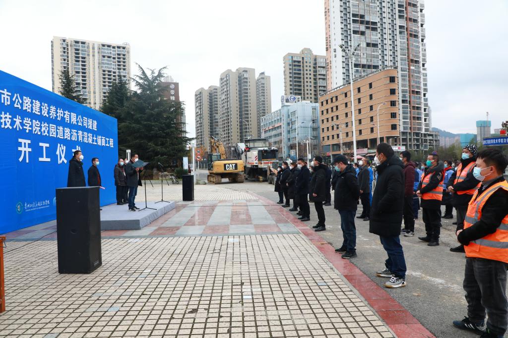 2022年12月20日下午,毕节市公路建设养护有限公司援建我校校园道路沥青混凝土铺面工程开工仪式在学校艺术广场隆重举行。我校党委委员、副校长赵军,毕节市公路建设养护有限公司代表养护工程项目经理陈继凯出席开工仪式,毕节市公路建设养护有限公司施工团队、我校相关部门负责人参加开工仪式。开工仪式由我校对外合作交流处处长李文彬主持。
